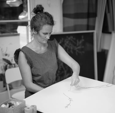 Guidée par la préciosité, Fanny créé des oeuvres brodées. Elle entrecroise les matières pour créer du mobilier et des tableaux. La broderie dompte des supports comme le bois, le grés ou le papier. Sa démarche se décline dans des projets sur-mesure.
